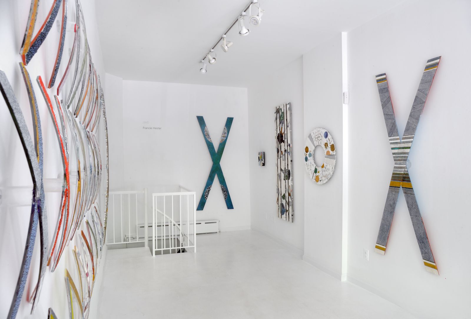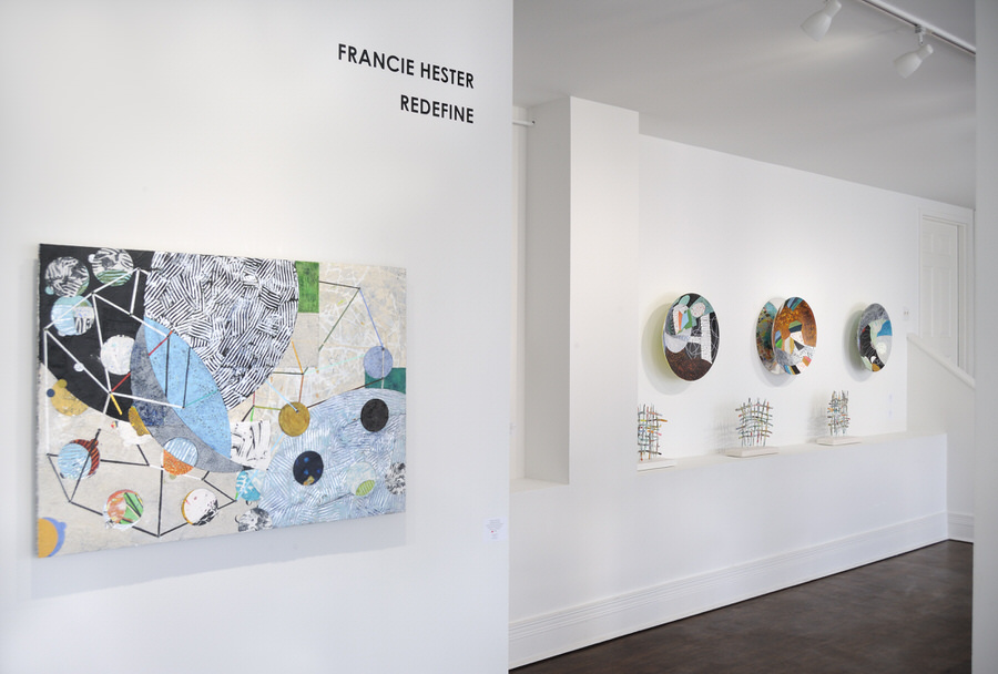 "Hard-edged yet improvisational, Hester’s artworks suggest both imaginary scientific diagrams and an industrial form of quilting. Also in the show are examples of two other series, the vertically oriented “Strata” and the smaller, square-formatted “Crossing Lines.” The latter set is inspired by literal as well as figurative lines, the artist writes, including headlines and bloodlines. The pictures appear methodical yet incorporate gestures that are soft and clearly intuitive. The reliance on metal panels and leaf doesn’t prevent Hester from employing a gossamer touch."